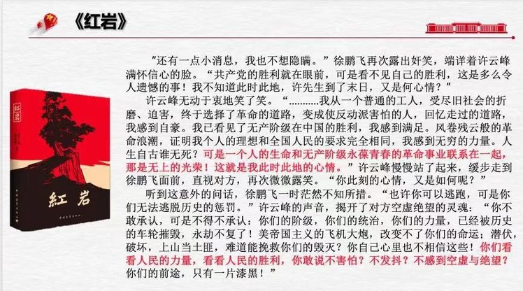 中国古代文学专业的周宇杰和中国现当代专业的房千群同学共同分享了《红岩》读后感。在她们看来,书中塑造了一批具有伟大精神的英雄人物,可以帮助我们深入理解一种跨越时空、久经磨难的伟大精神。小说中最动人的情节、最令人崇拜的英雄,都有现实依据和人物原型,是一本真正的“血写的书”。回顾历史,展望未来,我们新一代共产党员也应自觉学习、践行先辈精神。从红色经典书籍中不断汲取精神养分,激励我们在伟大的新时代奋勇前行。