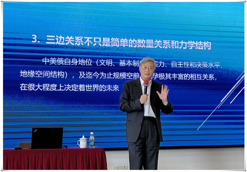 冯绍雷教授的讲座从研究当代中、美、俄三国关系的意义切入,通过回顾三边关系的历史进程和冷战后三边关系的趋势性现象,进而分析三边关系中的决定性因素和不同时期的关系类型,多维度解析了中、美、俄三国当前关系的特点与走向,以及对当今世界秩序的影响。