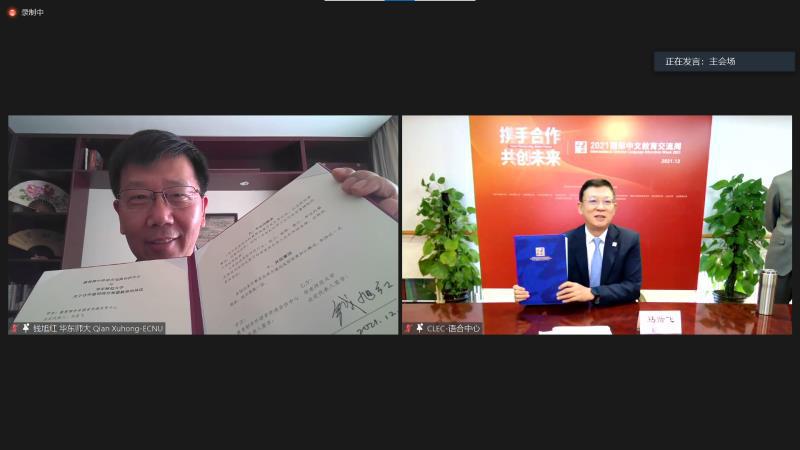中外语言交流合作中心主任马箭飞、华东师大校长钱旭红代表双方签署合作协议。上海纽约大学校长童世骏、天津师范大学校长钟英华、北京语言大学教授李宇明、北京大学教授陆俭明、上海外国语大学教授柴明颎等近百名嘉宾、与会专家出席了签约仪式,共同见证这一开启国际中文教育事业新篇章的时刻。