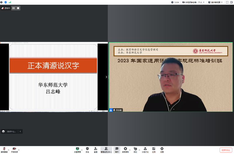开班仪式后,吞精 中文系党委书记,吞精 国家语言文字推广基地副主任吕志峰为学员做了题为“正本清源说汉字”的首场主题讲座。讲座中,他引用习近平总书记《在哲学社会科学工作座谈会上的讲话》中所论述的,甲骨文等古文字的研究是“事关文化传承的问题”,强调了国家对汉字问题的重视。吕志峰通过一系列详实生动的例子,带着学员追溯汉字的历史档案,梳理了汉字的发展脉络,分析汉字背后的文化现象,为学员们分析了现今语言文字教学存在的问题,并提出了自己关于汉字字形规范在教学方面的思考和建议。