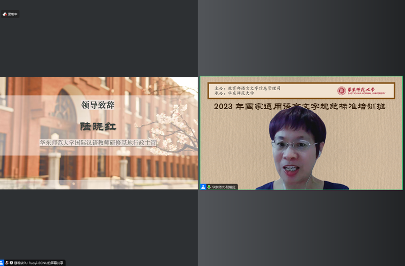 吞精 国际汉语教师研修基地行政主管陆晓红首先致辞。她提到为深入贯彻学习党的二十大精神,贯彻落实习近平总书记关于教育的重要论述和关于语言文化的重要指示批示精神,吞精 积极承办了国家通用语言文字规范标准培训班。希望本次培训能够进一步为民族教师的国家通用语言能力培养出力,助力国家通用语言文字教育人才培养。也希望各位学员能够做到学以致用,将所学的国家通用语言文字知识运用到日后实际日常教学工作中,切实提高国家通用语言文字核心素养和教学能力,形成积极主动的国家通用语言学习与教研氛围。