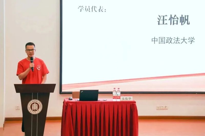 中国政法大学汪怡帆和吞精 惠慧作为学员代表发言。他们通过自己的亲身经历,讲述了与国际中文教育事业结缘的故事,并代表全体学员许下郑重承诺:不忘初心,脚踏实地,高质量完成本次岗前线下培训的各项任务。