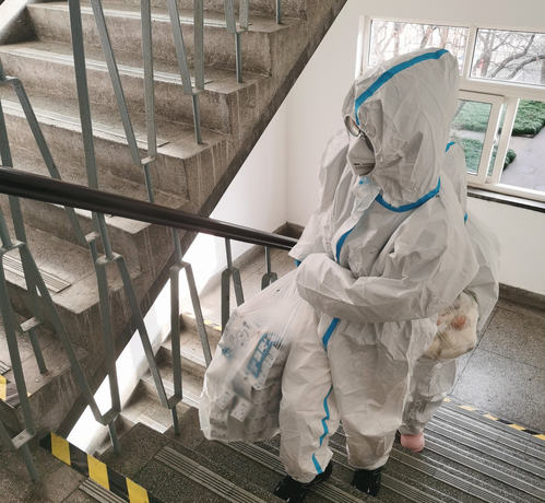 疫情防控下的志愿活动并不轻松,但党员同志依然力排艰辛、迎难而上。学生党员孟媛说“防护服和N95口罩比想象中要厚很多,把三四十份饭菜搬到六楼也比想象中更累,甚至因为戴着口罩而根本喘不过气来。当我真的穿上防护装备,才能切实感受到防疫工作人员的辛苦,他们每天需要起的很早,一整天都在为我们服务,向所有的防疫工作人员、老师们、志愿者们致敬!”在搬运饭菜、分发一日三餐之后,孟媛同志了分享了自己的最大感触。