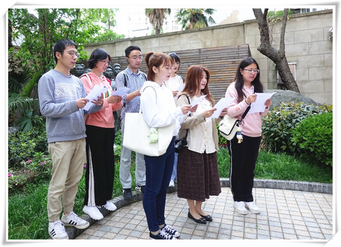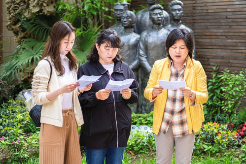 第三站是中国左翼作家联盟成立大会会址纪念馆,各支部在左联文化名人塑像前进行了诗朗诵表演。为了让党员们加深对革命文艺的印象,支部整理了《左翼文学作品及影视作品阅读书目》,党员们通过阅读重温红色经典,感受革命文学魅力。师生们声情并茂地朗诵了丁玲的小说《莎菲女士的日记》、胡也频的诗歌《光明在我们前面》和鲁迅转为纪念“左联”五烈士而写的杂文《为了忘却的纪念》等左联文学作品,表达了对左翼作家们的崇高敬意和深切怀念。