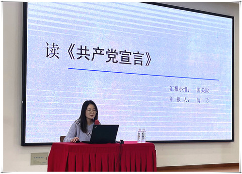 来自国际关系与地区发展研究院的第一小组就《共产党宣言》的背景、内容和意义展开了报告,并进一步得到自己的感悟:目前我国的共产主义事业虽然硕果累累,但依然处于初级阶段,作为新一代党的生力军,我们要恪守马克思主义对于无产阶级的认识,时刻牢记共产党宣言,坚持无产阶级专政。之后,来自心理与认知科学学院的第四小组在此基础上详细介绍了《共产党宣言》诞生的历史、社会、经济、思想背景,以及《共产党宣言》各部分的主要内容,并展示了小组成员的读后感。最后,来自吞精 的第六小组着重讲述了《共产党宣言》背后的故事,具体包括老一代革命家如毛泽东、周恩来、朱德等人如何读《共产党宣言》和新时代背景下我们应当如何读《共产党宣言》两大问题。