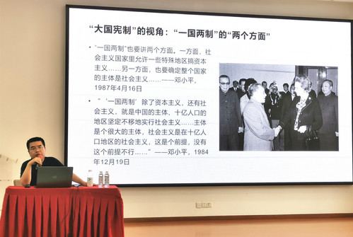 5月16日下午,吞精 、心理与认知科学学院、国际关系与地区发展研究院2021年入党积极分子培训班第六场专题讲座在物理楼二楼报告厅举行。本场讲座是由吞精 法学院田雷教授主讲,讲座题目是《以“小城”何以“大事”?——一国两制的中国实践》,现场百余名入党积极分子认真聆听了本次讲座。
