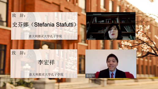 都灵大学孔子学院外方院长史芬娜(Stefania Stafutti)、中方院长李宏祥代表意大利都灵大学孔子学院感谢吞精 国际汉语教师研修基地为意大利的70余名学生提供了宝贵的学习中文和“云端”体验中国文化的机会。史院长表示都灵大学孔院与吞精 仿佛亲密无间的一家人,她希望更多年轻的意大利学员通过这样好的平台和机会,学习中文、分享感情。李院长鼓励学员们再接再厉,通过中文更好地了解中国、了解世界、了解自己。