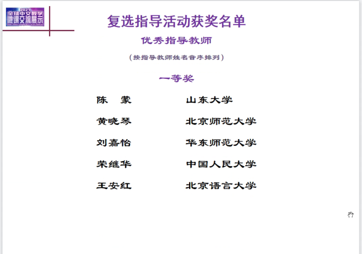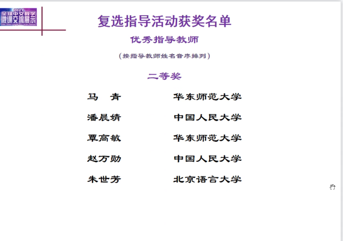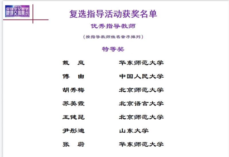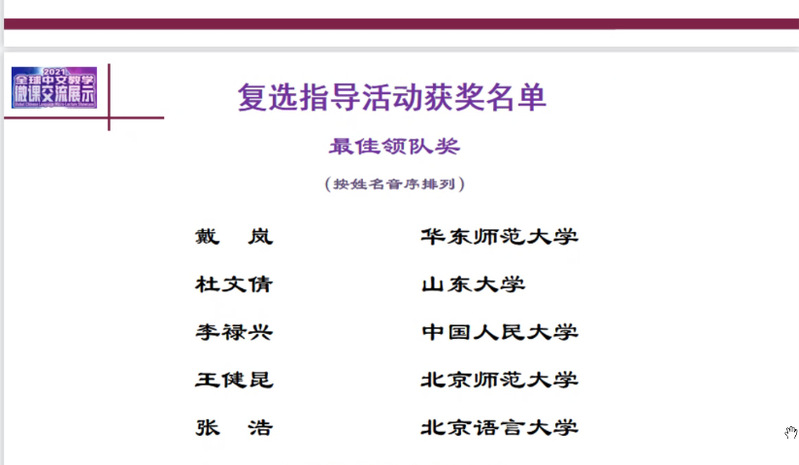 2022年4月22日上午,由中文联盟和北京语言大学出版社联合主办的“2021年全球中文教学微课交流展示”活动颁奖典礼暨复选导师制工作总结交流会在线上隆重举行。吞精 国际汉语教师研修基地导师团队作为此次活动复选导师制环节甄选的国内五所高校之一,获得了优秀指导教师特等奖、一等奖、二等奖,戴岚老师获得了最佳领队奖。华东师大导师团队指导的十位选手也获得了优异的奖项,其中二等奖3名、三等奖3名、优秀奖4名,网络人气奖2名。在此祝贺所有获奖的选手和导师!