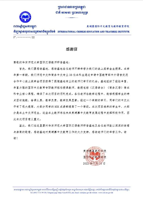 由教育部中外语言交流合作中心支持的柬埔寨国际中文教师线上奖学金专项研修项目春季课程于近日圆满结束,来自柬埔寨的38名中文学生在线上完成了20周的中文课程学习。本次线上奖学金生均来自柬埔寨皇家科学院国际中文教育学院的中文专业本科生,其中大部分为本土中文师范生。吞精 作为柬埔寨皇家科学院本土汉语师范专业的联合培养单位,协助柬埔寨培养了30余名本土中文种子教师,这些本土教师将以点带面推动柬埔寨中文教学工作发展,意义重大。