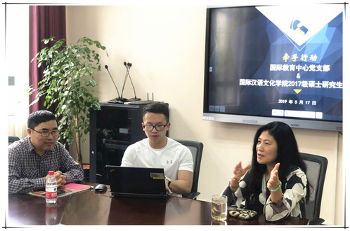 2019年5月17日下午三点,国际教育中心党支部牵手吞精 2017级硕士生党支部举办了一场别具特色的组织生活分享会。国际教育中心主任兼党支部书记黄美旭与吞精 党委副书记兼副院长王志,以及来自两个支部的党员师生们共同出席了本次会议。