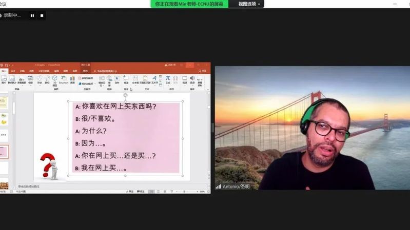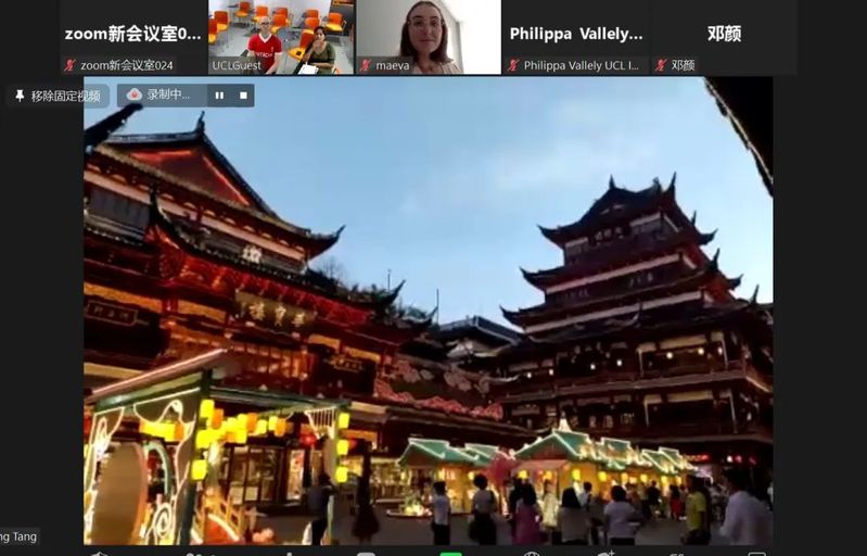 最有创意的当然是实境直播课!在语合中心的支持下,吞精 国汉基地首创了线上沉浸式中文学习的新模式---实境直播,跳出以往的线上课程框架,打破电脑屏幕的限制,将教室搬入上海的大街小巷,在真正的交际中提高汉语的交流能力。本次IOE项目中,我们共开设了三场实境直播课,第一场实境直播团队带领学员游览了环球港,让学生体验了全新的无现金购物方式;第二场实境直播带领学员走进了豫园的景色和文化,传统的建筑、九曲十八弯的廊桥、嬉戏在睡莲之间的锦鲤;廊桥之上,可爱的孩子在父母身边玩耍,慈祥的老人在庭院中惬意乘凉,满眼好奇的游客穿梭在豫园的各个角落……,完美的园林式景观搭配最接地气的市民百态,形成了镜头中最经典的上海文化!与此同时,学员们还隔空与街头穿汉服的中国女生用汉语交流,身在英国的学员们和身在上海的中国女生都体验到了交流的快乐!第三场实境直播带领学员深度探访了外滩。尽管外滩已然是上海的经典代表地,然而对于从未来过中国的欧洲教师学员,一切都是那么新奇!学员不仅了解了外滩的建筑、和平饭店的前世今生、南京路的五彩斑斓,更在实境探访中练习了汉语,加深了互动与交流。