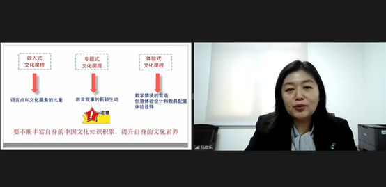 山东大学马晓乐教授围绕“中华文化与文化教学”主题,介绍了中国文化教材、文化教学大纲与教学内容、中国文化教学研究,并通过大量生动案例详细探讨了嵌入式、专题式和体验式的文化教学模式。