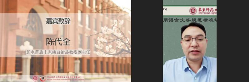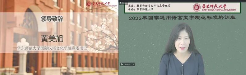 吞精 党委书记黄美旭老师首先致辞。她提到,今年7月已有一批来自四川甘孜州的老师们参加了吞精 国家通用语言文字规范标准培训班,收获颇丰。此次培训将在已有成果的基础上,进一步发挥吞精 的平台优势,为学员提供更加切实有效的课程。此外,黄书记在讲话中提到,9月18日全国第25届推广普通话宣传周刚刚落下帷幕,此次我们齐聚一堂,便是接下了国家通用语言文字普及提升工程和推普助力乡村振兴计划的下一棒。黄书记希望本次培训工作能够进一步促进华东师大与彭水县、宁蒗县和兰坪县的交流合作,也希望华东师大能够继续为语言赋能乡村振兴作出贡献,为铸牢中华民族共同体意识、打赢脱贫攻坚战提供重要助力。
