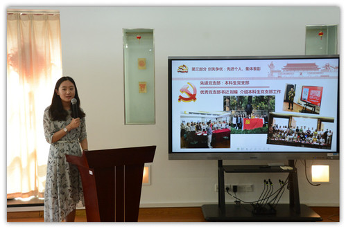 为深入学习贯彻习近平新时代中国特色社会主义思想和党的十九大精神,推进“不忘初心,牢记使命”主题教育活动,激励和引领全体党员奋发有为,创先争优,经学院党委决定,对评选出的3位优秀共产党员石旭登、张虹倩、周屹,1名优秀党支部书记刘瞳以及先进本科生党支部进行表彰。黄薇宣读《表彰决定》。三位优秀共产党员所在党支部的支部书记王琦、张德劭、易兰分别致颁奖词并为获奖个人颁发荣誉证书。院优秀党支部书记、辅导员刘曈为大家介绍了本科生党支部过去一年的工作和取得的成绩。
