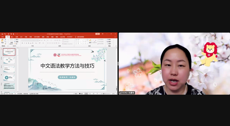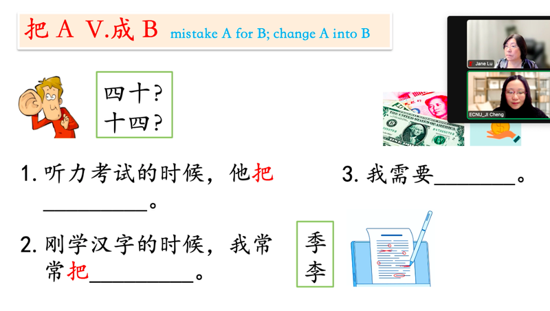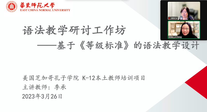 北京时间2023年3月26日上午8点,国际汉语教师研修基地中文教师季承、刘嘉怡以“中文语法教学技巧”为主题,为基地与美国芝加哥大学孔子学院合作的K-12本土教师培训项目开展了线上教学研讨工作坊。