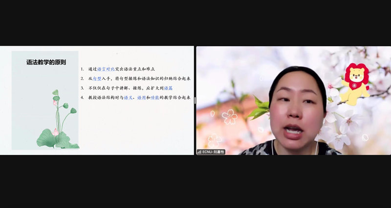 第二部分由季承老师主讲。季老师首先和大家明确了中文语法教学的两大目标,然后结合《国际中文教育中文水平等级标准》提出的衡量学生学习成效的三项指标“言语交际能力、话题任务内容、语言量化指标”,通过自己在课堂中遇到的真实教学案例,和学员们详细讲解了如何更为有效地把语法概念解释清楚、如何设计出更加符合交际目的、有利于话题表达训练的教学活动。