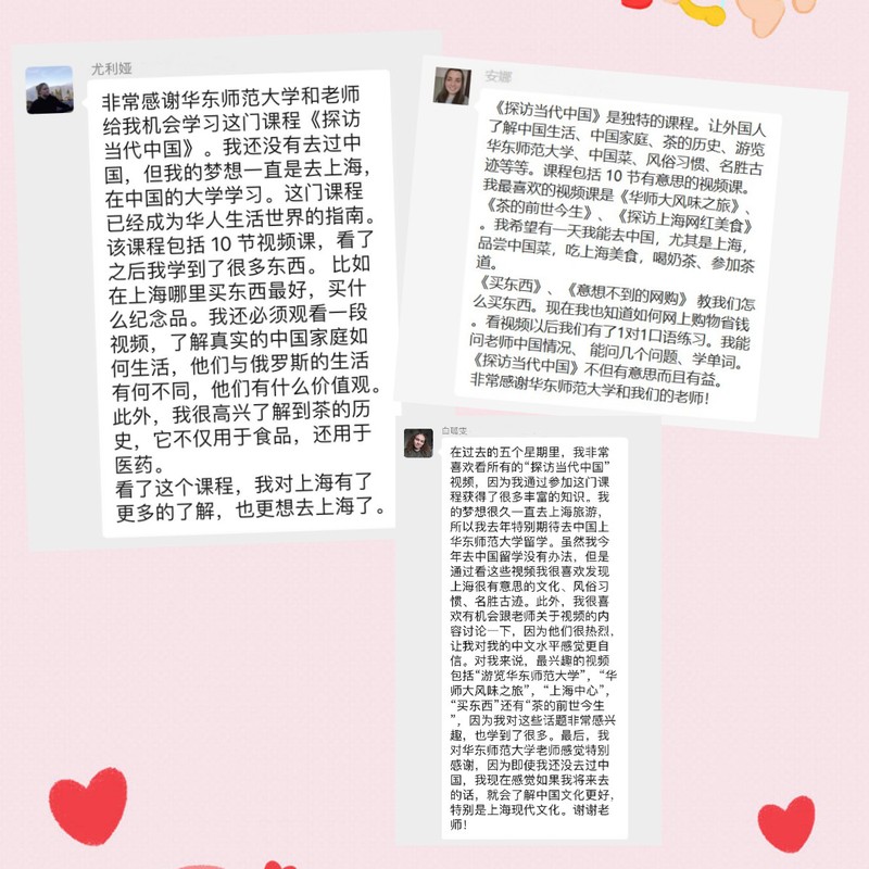 尤利娅(俄罗斯):非常感谢吞精 和老师给我学习《探访当代中国》课程的机会。我还没有去过中国,但我的梦想一直是去上海,在中国的大学学习。这门课程里的10个视频让我学到了很多东西,比如在上海哪里买东西最好,买什么纪念品。我还了解了真实的中国家庭如何生活,他们与俄罗斯的生活有何不同,他们有什么价值观。此外,我很高兴了解到茶的历史,它不仅用于食品,还用于医药。现在我对上海有了更多的了解,也更想去上海了。