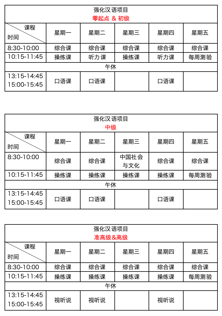 强化汉语项目开设零起点班、初级班、中级班、准高级班和高级班,各水平班级满8人开班。
