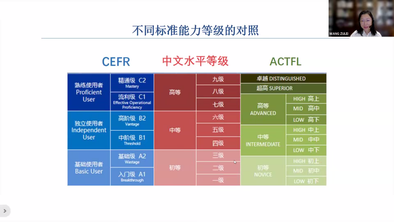 王祖嫘老师介绍了中文等级标准的制定背景、目的以及其独特的评估体系,同时通过与欧美主要标准(如欧盟的CEFR和美国的ACTFL)进行了对比,使学员更好地理解《国际中文教育中文水平等级标准》与欧洲、美国语言标准中的异同点。