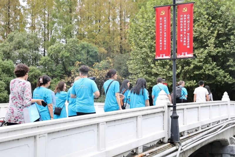 开班仪式结束后,学员们跟随助教一起参观了吞精 校园,在葱郁的水杉林前了解丽娃河的由来,通过校园地标建筑了解师大历史,感受师大人“求实创造,为人师表”的追求。初秋的校园美景引得老师们频频驻足,在一片欢声笑语中正式开启了这段珍贵的研修之旅。
