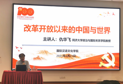 6月23日下午,为迎接中国共产党建党100周年,进一步推动党史学习教育深入人心,吞精 党委在物理楼二楼报告厅开展党史学习宣讲活动,宣讲邀请了上海市教卫党史学习教育专家宣讲团专家、同济大学政治与国际关系学院教授、中美关系研究专家仇华飞教授,为全院教师和学生党员们作题为《改革开放以来的中国与世界——习近平治国理念之大国崛起》的讲座。学院党委书记黄美旭主持讲座。